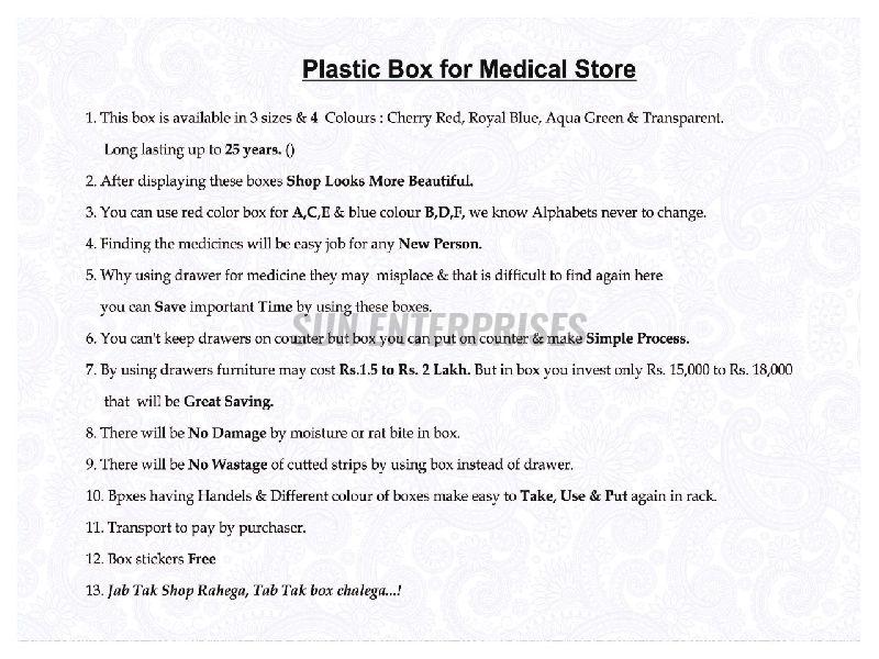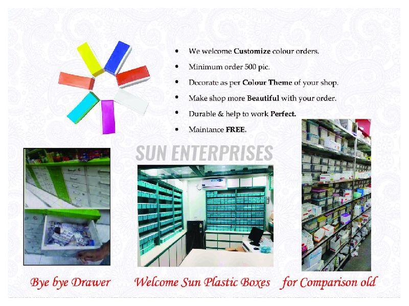 These plastic boxes are use for storing Medicines in medical shops. Four colours and four sizes will make your shops easy to manage and make your shops look beautiful.